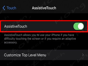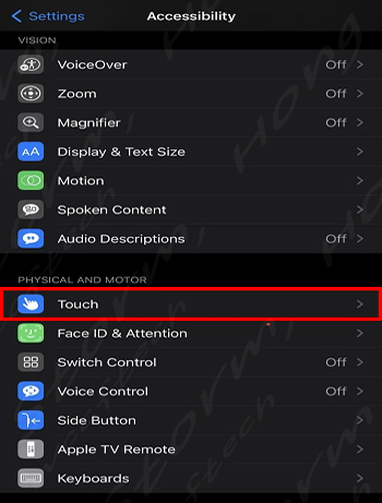 3. 터치 (Touch)를 누른 다음 AssitiveTouch를 탭 한 후 사용 (ON) 으로 바꾸어 줍니다.