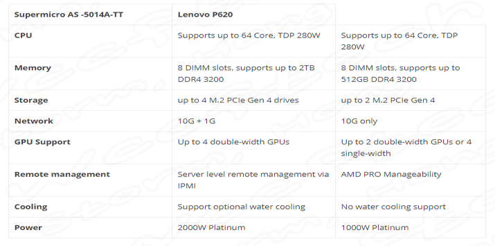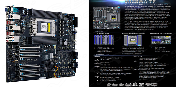 메인보드 외에도 Supermicro는 동일한 메인보드, 2000W Platinum PSU 및 옵션 수랭 지원을 특징으로 하는 AS-5014A-TT 워크 스테이션을 발표했습니다. 몇 가지 주요 기능은 다음과 같습니다.확장 슬롯에는 PCIe Gen 4.0 x16 슬롯 6개, 전체 높이 M.2 (Gen 4.0) 슬롯 4개가 포함되며 스토리지 옵션에는 SATA III 포트 4개와 U.2 포트 2개가 포함됩니다. 메인보드에는 WRX80 칩셋 위에 활성 팬 솔루션이 있습니다. 마더 보드는 2 개의 트리플 와이드 그래픽 카드, 4개의 더블 와이드 그래픽 카드 및 6개의 표준 그래픽 카드를 지원합니다. 온 보드 I / O에는 10GB Aquantia LAN, 1GB Intel LAN, 1개의 USB 3.2 Gen 2x2 포트, 5개의 USB 3.2 Gen 2 포트, 5개의 USB 3.2 Gen 1 포트 및 2개의 USB 2.0 포트가 포함됩니다. 추가 헤더에는 최대 10개의 4핀 팬 헤더, 7.1 채널 HD 오디오 Realtek ALC4050H + ALC1220이 포함됩니다.