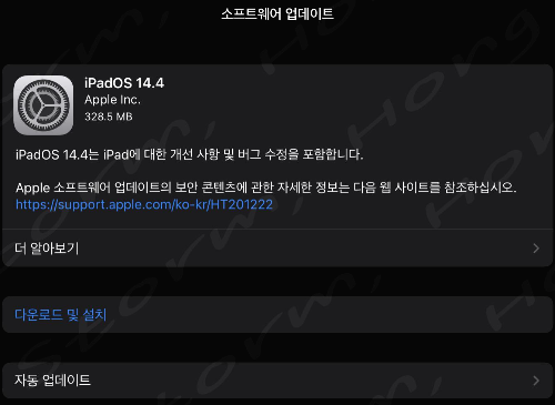 iPadOS 14.4 설치 공간은 328.5MB 입니다. 이전의 iPadOS 14 버전 중 업데이트를 하지 않으신 분들은 한꺼번에 설치해야 하므로 용량이 클 수 있습니다.
