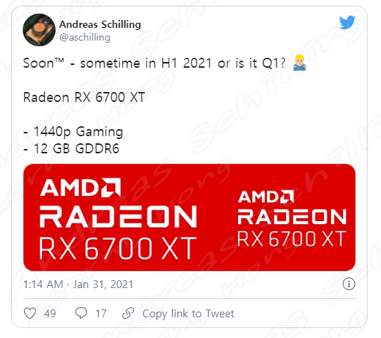 CES 2021에서 AMD는 2021년 상반기 AMD Radeon RX 6700 XT를 포함하여 더 많은 주류 RDNA 2 그래픽 카드를 도입할 것이라는 이야기가 나왔습니다. 이는 HardwareLuxx의 편집자인 Andreas Schilling는 더 많은 정보를 확인한 것 같다고 했습니다.