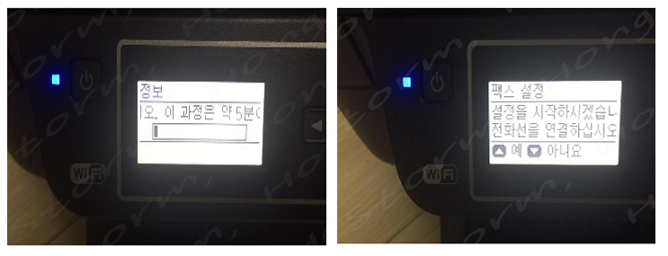 6. 전원을 끄지 않고 약 5분 정도 기다리면 ↑ 오른쪽 그림과 같은 팩스를 설정하라는 메시지가 나옵니다.