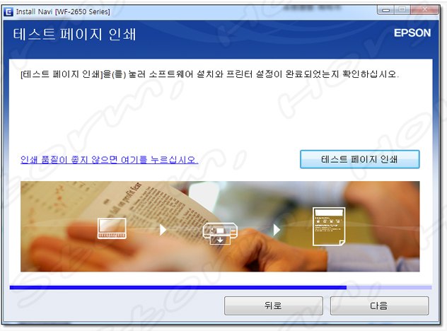 14. CD 설치가 끝나는 경우에는 다음과 같은 화면이 나오게 됩니다. 또한 직접 적으로 설치하는 경우 Test화면이 나오게 됩니다. 이때 테스트를 통해 프린터 설치를 마무리 해주시면 됩니다.