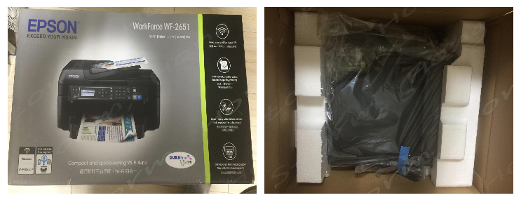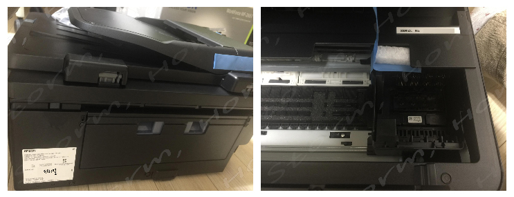 ↑ 왼쪽 사진은 박스 반대쪽 사진으로 프린트의 모양 사진과 와이파이 연결로 와이파이 연결이 가능한 장치와 Wi-Fi Direct를 이용하여 인쇄가 가능합니다. 오른쪽 사진은 박스를 열은 윗면 사진입니다. 프린터가 안전하게 박스에 들어가 있을 수 있도록 양쪽에 스티로폼으로 움직임을 방지하도록 되어 있습니다.
