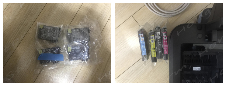 ↑ 왼쪽 사진은 잉크 4개가 밀봉되어 잉크가 흐르거나 하는 것을 방지하도록 되어 있습니다. 용량은 기본 제공량이며, 많은 인쇄가 되지 않습니다.