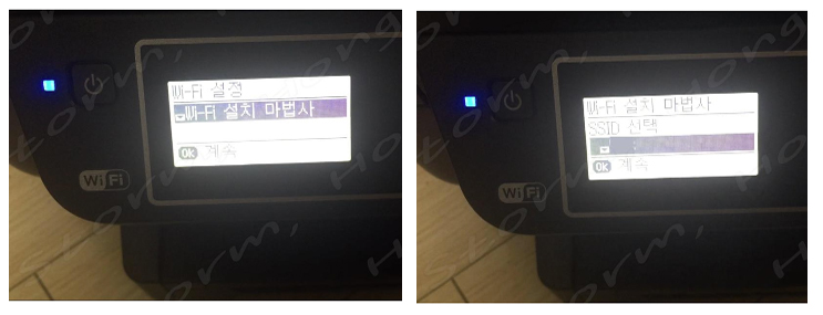 7. 보통 USB 드라이버로 연결하여 프린터를 연결하는 반면 이 제품은 USB 방식 외에 Wi-Fi로 연결도 가능합니다. 연결하기 위해서는 네트워크를 설정 SSID를 입력 후 자신이 설정한 Wi-Fi 네임을 설정 및 선택을 합니다.