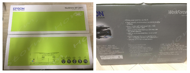 ↑왼쪽 사진은 박스 윗면에는 연두색 바탕과 제품명 크기 스캐너의 Dpi 사이즈, 프린트 Dpi, 프린터에 달린 LCD가 나와 있습니다. 오른쪽 사진은 프린트의 스펙이 적혀있습니다. 인쇄, 스캔, 팩스, 무선랜 지원 150매까지 급지가 가능하며 ADF지원으로 여러 장 동시에 스캔이 가능하며, Epson Connect로 스마트폰 , 태블릿 PC로 어디서나 인쇄 및 스캔이 가능하다는 정보가 나와 있습니다.