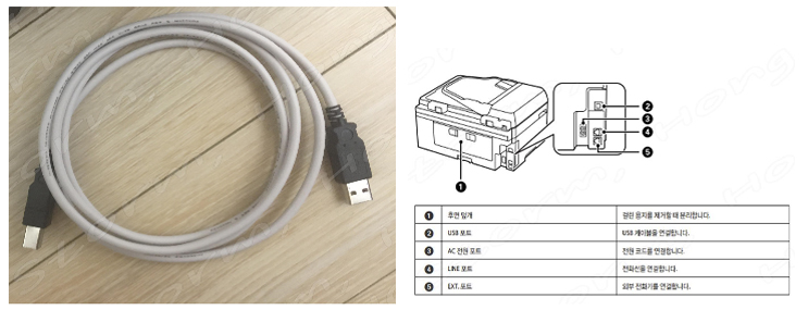 ↑ 왼쪽 사진은 PC에 연결할 수 있는 USB 케이블입니다. 케이블은 B type to USB A Type USB 2.0 사진입니다. 오른쪽 사진은 USB와 전원 케이블을 연결하는 곳을 표시한 사진입니다. 전원 케이블은 이 프린트에 중요한 케이블인 8가로 이루어져 있습니다.