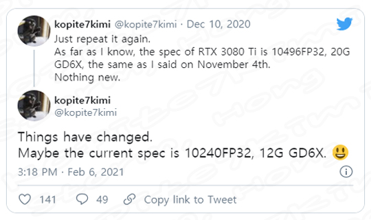 NVIDIA의 곧 출시될 것으로 보이는 NVIDIA GeForce RTX 3080 TI (엔비디아 지포스 RTX 3080 TI) 에 대한 새로운 정보는 Kopite7Kimi에서 이와 같은 정보를 통해 알려졌습니다. 몇 차례 이와 같은 정보가 잇었습니다. 다양한 사양 변경이 있었고 출시라는 루머, 소문, 정보, 예상, 예측 등이었으나, 이번에 나온 내용을 보면 'NVIDIA는 코어 및 메모리 구성을 다시 수정하기로 결정했다'라고 알려졌습니다.