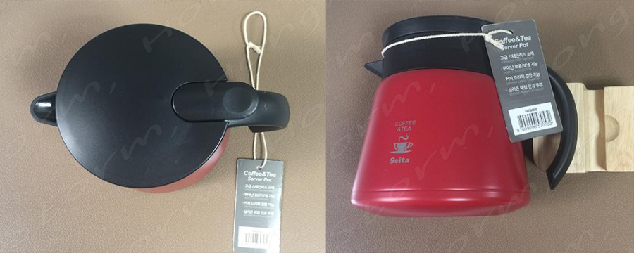 제품 상품 텍이 같이 있습니다. 바코드와 함께, 영어로 Coffee & Tea Server Pot, 스테인리스 소재, 뛰어난 보냉 / 기능, 커피 드리퍼 결합 가능, 실리콘 패킹 진공 뚜껑이라는 글씨가 적혀있습니다. '윤스테이' 에 등장한 Seita와 커피 로고를 통해서 이 제품이 어떤 제품인지 알 수 있었습니다. 그리고 색상의 조합이 모두 검은색으로 있을 때 보다 검은색 + 빨간색으로 되어 있어 조금 더 색다른 느낌을 줄 수 있습니다. 주변에 검은색 제품이 많은 사용자는 한 번쯤 검은색 + 빨간색의 조합으로 포인트를 주는 것도 나쁘지 않습니다.