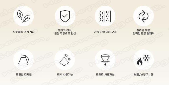 친환경 유해 물질 걱정 없이 사용이 가능한 재질로 되어 있어 안심하고 사용이 가능합니다. 또한 위 그림에서 설명한 보온/보냉 7시간의 기준은 직접 사용자가 사용하기에는 환경에 따라 많은 차이가 있을 수 있는 부분이기 때문에 각자 사용하는 데에서는 조금 다를 수 있는 부분입니다. (개인마다 편차가 있을 수 있습니다.)