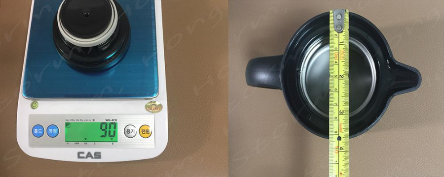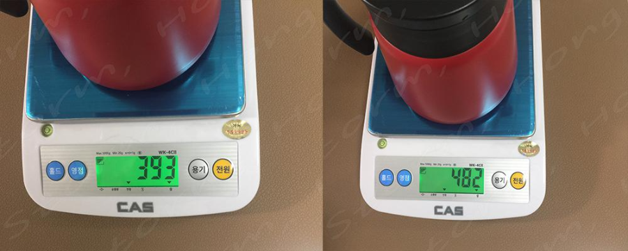 왼쪽 사진으로는 몸체의 무게 약 393g, 오른쪽 사진은 뚜껑 + 몸체의 무게는 약 482g 입니다.