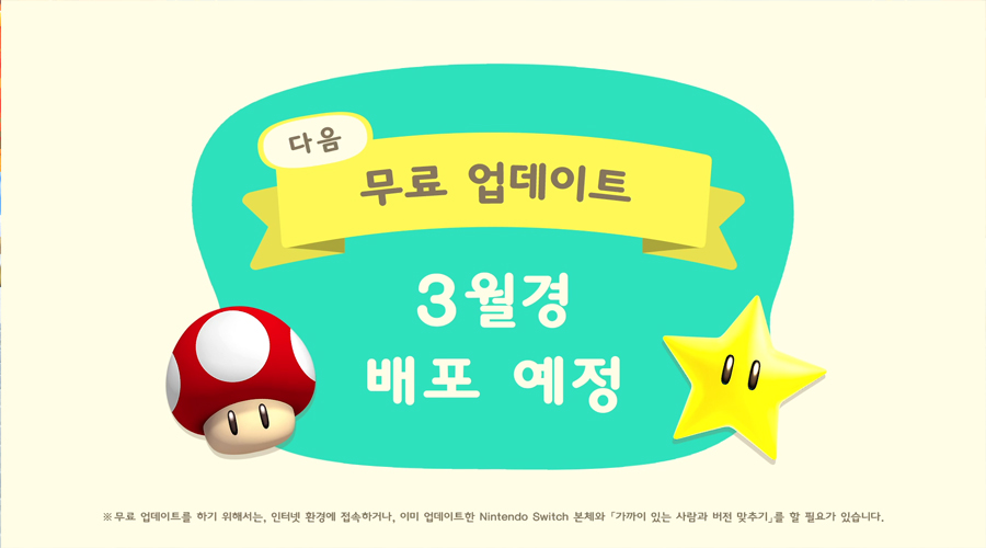 다음 무료 업데이트는 3월 경에 배포될 예정이며, 슈퍼 마리오 브라더스를 기념하는 가구가 추가된다고 합니다. 자세한 사항은 추후 소개해 줄 것이라고 합니다.