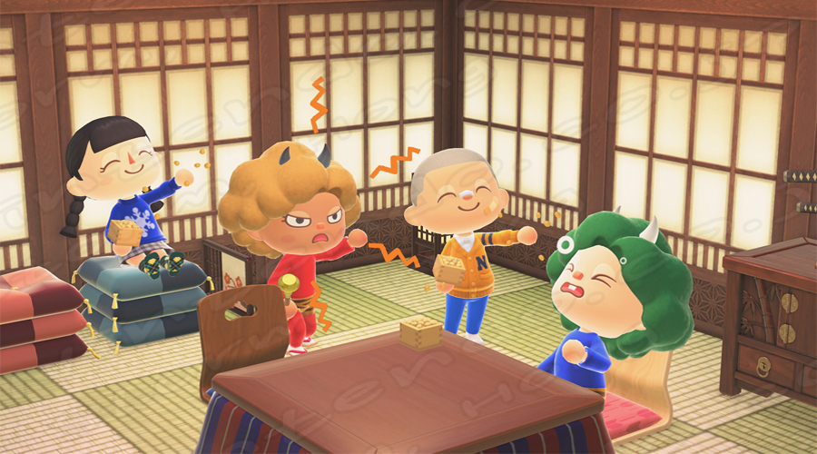 「하트 초콜릿」,「하트 장미 꽃다발」 은 날마다 다른 색과 다른 디자인이 진열된다고 합니다. 「너굴 쇼핑」에서, 「콩 뿌리기 세트」를 2월 3일까지 주문할 수 있다고 합니다. 아래 화면과 같은 도깨비 의상도 2월 1일부터 옷가게 「에이블 시스터즈」에 진열된다고 합니다.