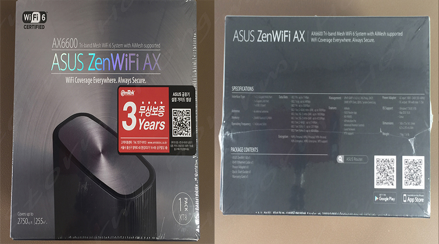 ↑ 위 제품은 1 Pack 제품입니다. 3년 A/S를 알리는 스티커 그 옆에는 QR코드가 있으며, Wifi 6을 지원한다는 마크가 나와 있습니다. 또한 박스 왼쪽 면에 적혀 있는 내용은 스펙 사항, Google Play와 AppStore에서 다운로드할 수 있는 QR코드 내용이 적혀 있습니다.