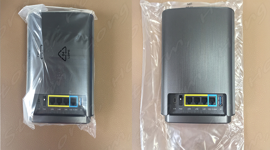 공유기 연결 포트로는 왼쪽을 기준으로 DCIN (전원 입력), 전원 스위치, 일반 LAN 포트 3개 (LAN3, LAN2, LAN1)로 노란색으로 표시, WAN은 1G (1 기가 랜 포트) / 2.5G (2.5G) 지원 , USB 3.1 Gen1을 지원합니다.
