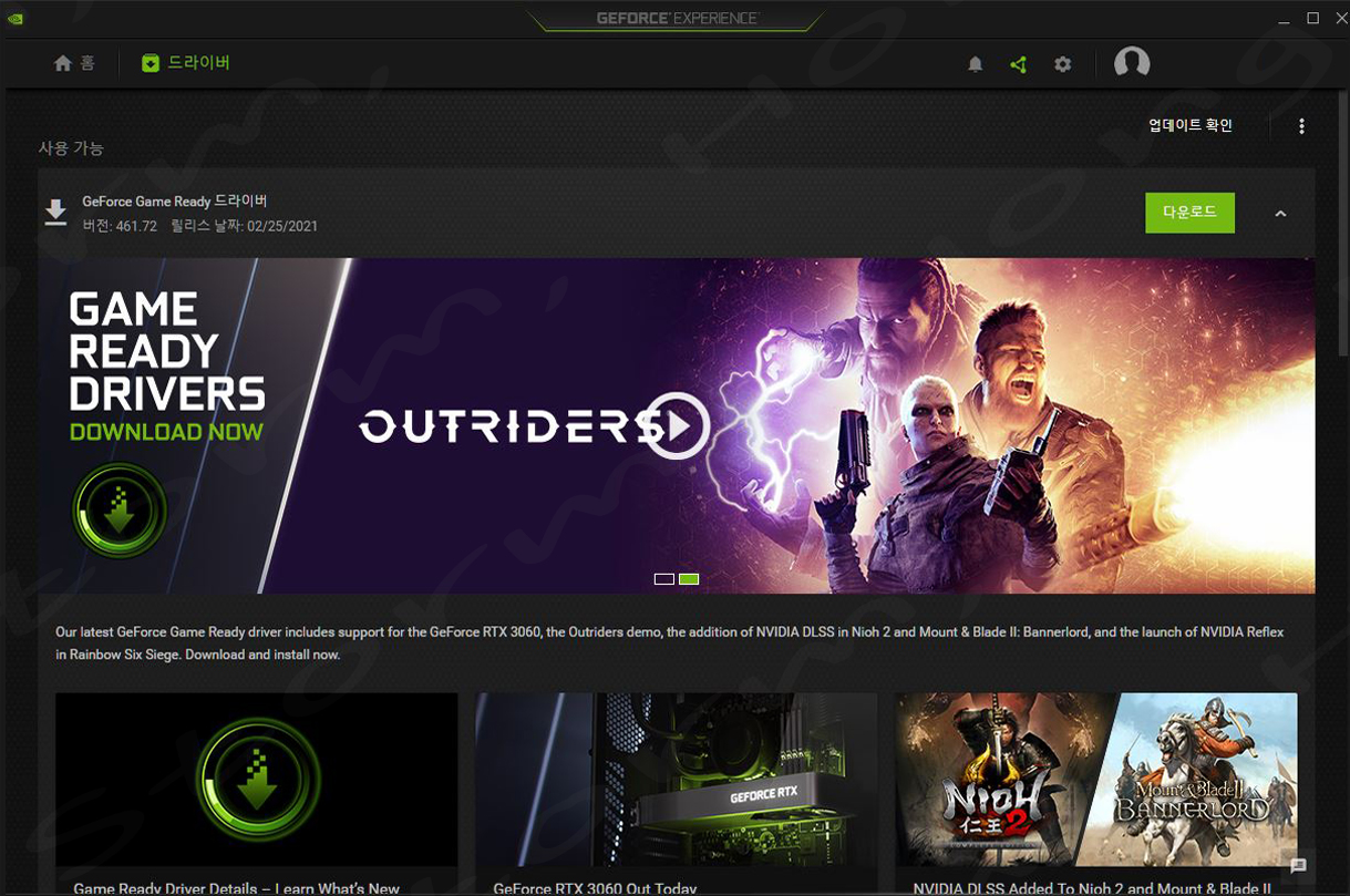 새로운 NVIDIA GeForce Game Ready 드라이버가 출시되었으며, NVIDIA GeForce RTX 3060 GPU (엔비디아 지포스 RTX 3060 GPU) 등을 지원하는 업데이트입니다. 461.72 WHQL 드라이버 또한 Outrides 데모에 대한 지원과 Nioh 2 - The Complete Editio 및 Mount & Bladee Bannerlord에 대한 DLSS 지원을 제공한다고 합니다. 드라이버는 Rainbow Six Siege에 대한 NVIDIA Reeflex 지원을 제공한다고 합니다.