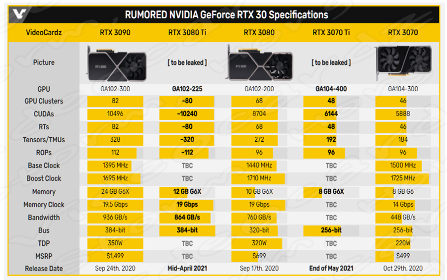 NVIDIA GeForce RTX 3080 Ti (엔비디아 지포스 RTX 3080 Ti)는 4월 중순에 약 USD 999 ($) 의 MSRP로 출시 예정이며, NVIDIA GeForce RTX 3070 Ti (엔비디아 지포스 RTX 3070 Ti)는 5월 말 USD 599 ($) 의 MSRP로 출시될 것으로 예상, 예측, 루머, 소문들에 의해 정보가 나오고 있습니다. 그러나 이에 대한 것은 나와봐야 알 것 같습니다.