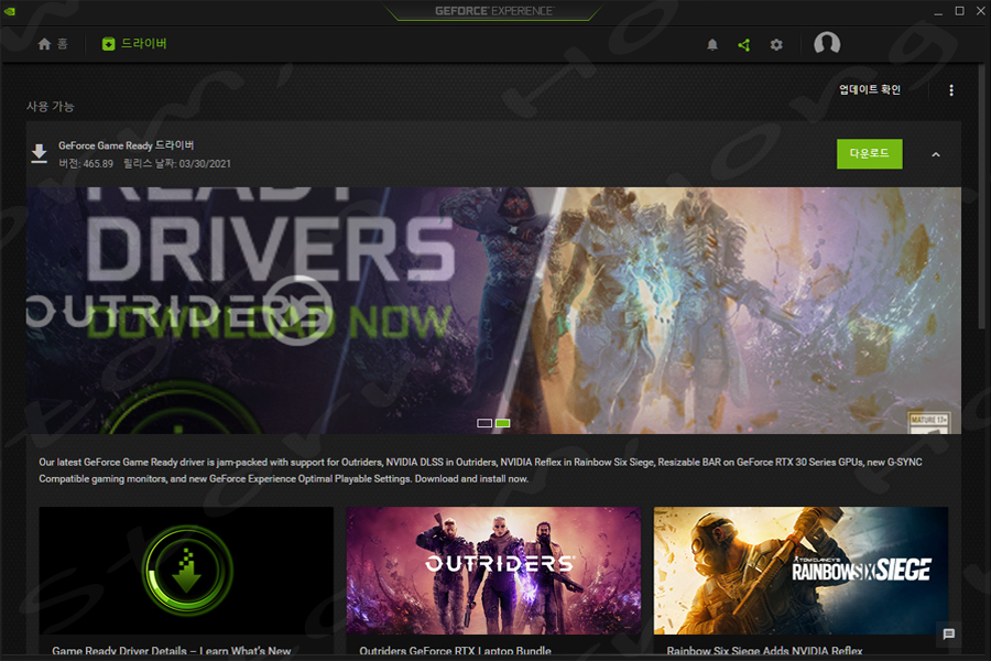 4. 최신 GeForce Game Ready 드라이버 (작성 당시 버전 465.89 WHQL, 2021 년 3 월 30 일 출시) 또는 이후 버전으로 업데이트