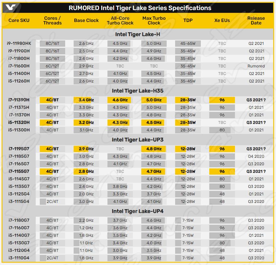 Intel (인텔)의 소매 업체 및 OEM번째 4가지 모델에 대한 예상, 예측, 루머, 소문등이 나왔습니다. 모델에는 Tiger Lake-U 2개 , Tiger Lake-H CPU 2개가 포함되어 있다는 예상, 예측, 루머 소문의 이었습니다. Intel (인텔)은 출시 예정, 예측, 루머, 소문의 Tiger Lake-H SKU에 대한 새로운 정보에 대한 제공하는 이유가 무엇인지 궁금해하는 이야기도 있었습니다. 하지만 새롭게 출시 예정, 예측, 루머 소문 라인업의 주인 쿼드 코어를 특징으로 H35변형을 위한 것으로 보이며, H45 변형에 대해서는 2021년 중반에 출시될 것이라는 예상, 예측, 루머 소문의 정보가 나왔습니다.