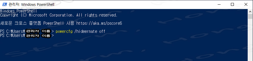 3) 명령어 powercfg /hibernate off 명령어를 적어줍니다. 이후 에러 메시지와 다른 메시지가 나오지 않으면 최대 절전 모드가 없어진 상태입니다.