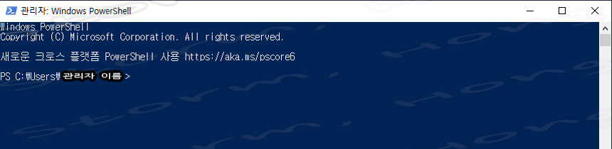 2) Windows PowerShell(관리자)(A) 을 누른 화면입니다. 다음으로 '예' , '아니오'가 나오는 경우 '예'를 클릭합니다. (사용자 이름은 임시로 적은 내용이며, 설정에 따라 조금씩 다를 수 있습니다.)