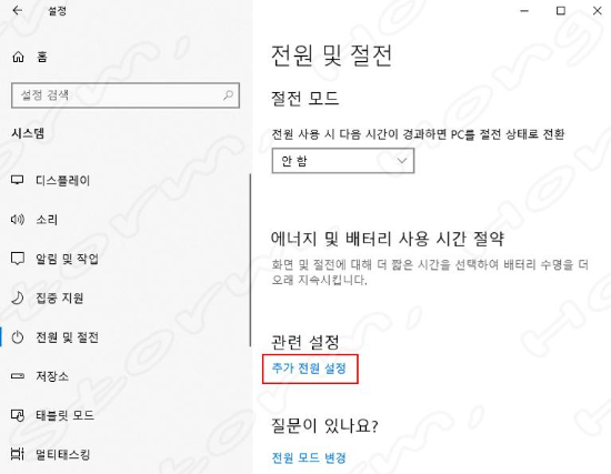 6) 이후 전원 및 절전에서 스크롤하여 추가 전원 설정을 클릭해 줍니다.
