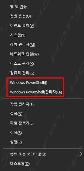 1) 먼저 윈도우키 + X 누른 후 Windows PowerShell(관리자)(A)를 눌러 줍니다.