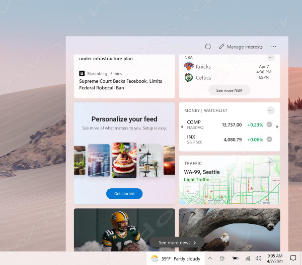 이제 작업 표시 줄의 날씨 위로 마우스를 가져가면 창 상단에 새로운 "관심 관리" 버튼이 나타납니다.이 버튼은 관심 있는 주제를 선택할 수 있는 새로운 전체 페이지 개인화 환경으로 연결됩니다. 새 사용자는 피드에서 시작하는 데 도움이 되는 개인화 카드를 볼 수도 있습니다.