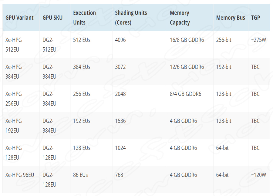 Intel Xe-HPG DG2 GPU 기반그래픽 카드 사양: 그래픽 카드 사양