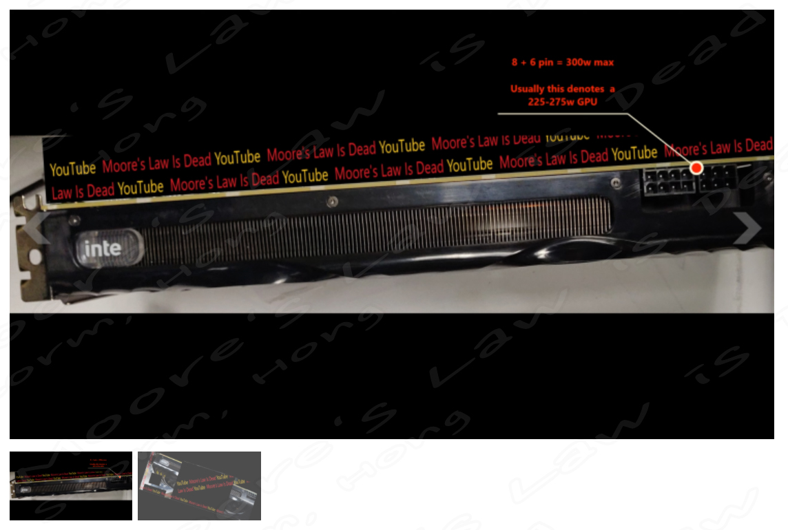 이 카드는 8 + 6 핀 커넥터 구성을 특징으로 하며, MLID는 Intel Xe-HPG DG2 게임용 개별 그래픽 카드의 예상 TDP가 최대 275W가 될것으로 예상, 예측, 루머, 소문이 나오고 있습니다. PCB 또는 뒷면은 MLID의 소스를 추적 할 수 있는 내용들이 포함하고 있으므로 누출 등이 표시되지 않았습니다.