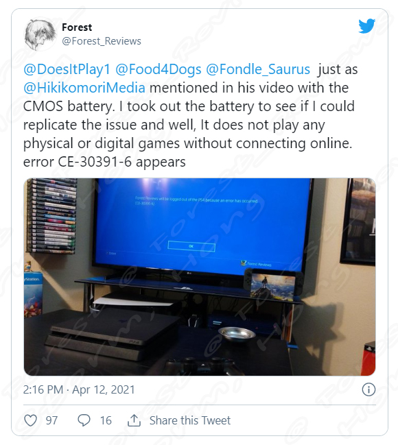 트위터 사용자 Forest (@Forest_Reviews)는 PS4 Slim (플레이스테이션 4 슬림) 모델을 구입하여 PS4 (플레이스테이션 4) 게임을 인터넷 연결 없이 CMOS 배터리가 불량하거나 누락되어 더 이상 작동하지 않는지 테스트하기로 결심하고 Test를 진행했습니다.