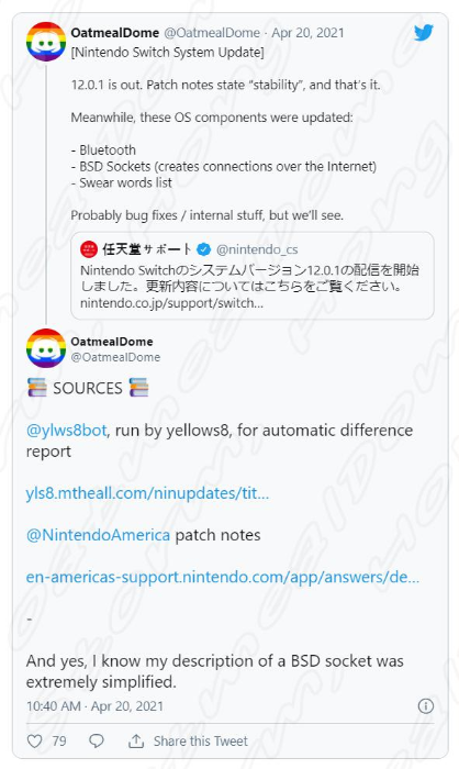 하지만 예측, 예상, 소문, 루머들에 의해 알려진 것은 '내부 변경 사항'을 다시 포함하는 것으로 보인다고 합니다. Nintendo 업데이트 봇으로 알려진 @ylws8bot에 의해 알린 내용에 의하면, Nintendo 데이터 마이너 @Oatmealdome이 알린 것처럼 새 펌웨어 업데이트에는 Blutetooth 시스템 모듈, BSD 소켓의 내용에 대한 변경 사항도 포함된다고 합니다.