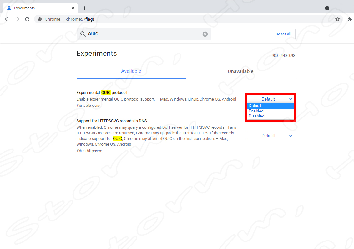*(Qyic프로토콜 = Quic UDP Internet Connection Protocol이며, TCP/IP Protocol을 대체하는 미래 지향성 기술입니다. UDP는 지금도 사용되고 있지만 QUIC는 아직 적용 단계입니다. QUIC의 기본 값은 Default로 되어 있어 이용하거나 이용하지 않아 필요하지 않을 경우에도 이용이 되는 경우가 발생합니다. 이에 충돌이 발생할 수 있습니다. 이에 Disable로 바꾸는 과정입니다.)