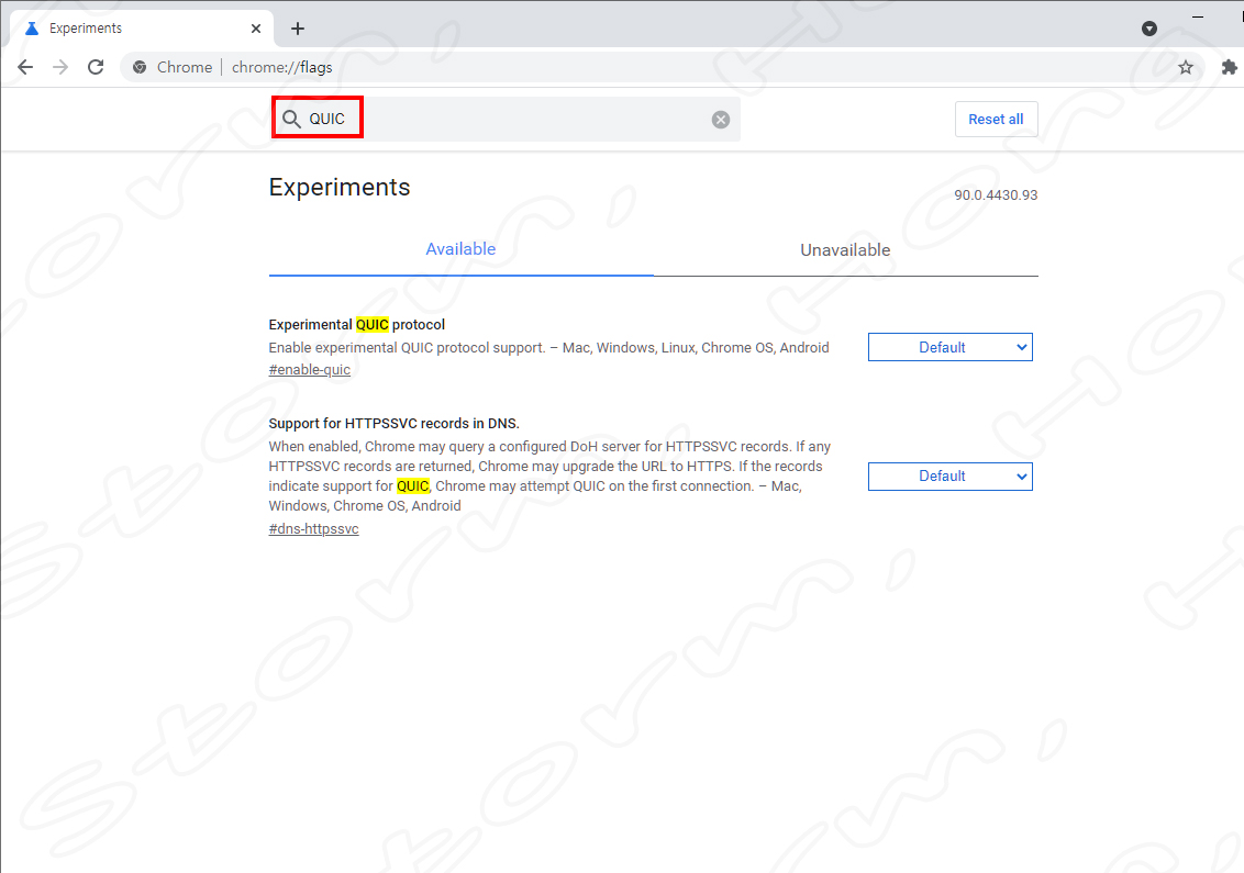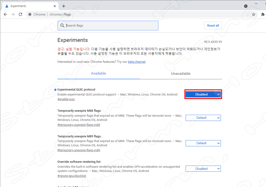 3. Search flags 입력란에 QUIC를 입력하면 다음과 같은 화면이 나타납니다.
