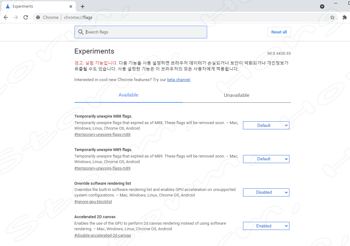 2. URL 주소창에 Chrome://flags를 입력 후 엔터를 입력하면, 다음과 같은 화면이 나타납니다.