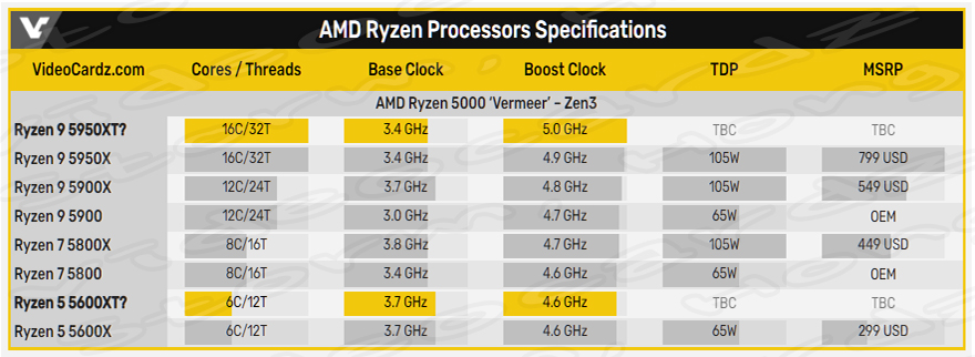 AMD Ryzen 9 5950XT, 라이젠 5 5600XT, 데스크탑 Zen 3 CPU에 대한 정보가 나오다?