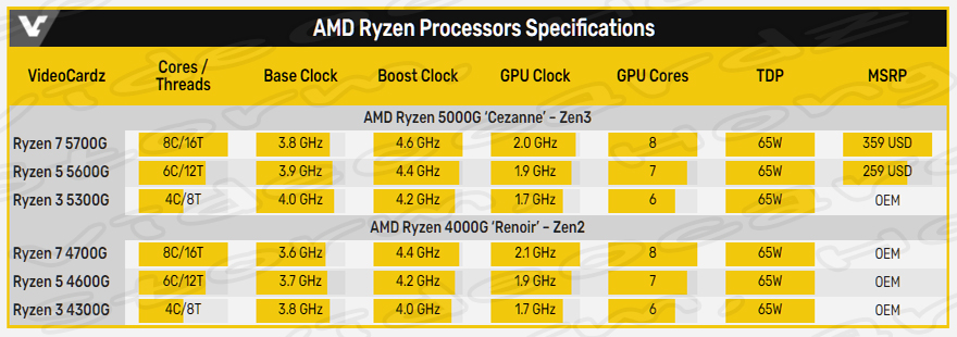 AMD Ryzen 7 5700G는 8개의 코어와 16개의 스레드로St구성되어 있습니다. 클럭 속도는 3.8 GHz 기본 및 4.6 GHz로 부스트 발표했습니다. CPU는 총 16MB L3 및 4MB L2 캐시를 가지며, TDP는 65W 입니다. APU는 약 2.0 GHz의 클럭 속도로 작동하며, 8 CU 또는 512 스트림 프로세서가 있는 Vega GPUI를 탑재한다고 합니다. 35W Ryzzen 7 5700GE는 동일한 사양을 제공하지만 3.2 GHz 기본 및 4.6 GHz 부스트 코어 클럭으로 가속한다고 합니다.