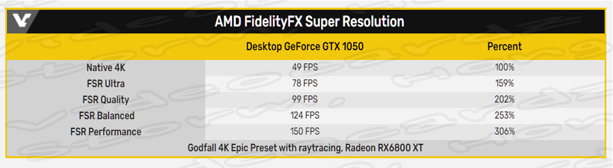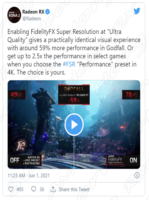 AMD COMPUTEX 2021 (컴퓨텍스 2021 행사)에서 AMD는 Ryzen CPU 외에도 NVIDIA DLSS와 경쟁하는 AMD Radeon RX 6000 RDNA GPU를 위한 FSR 'FidlityFX Super Resolution' 기술을 시연했습니다. 이는 RDNA 2 아키텍처에서 최적화된 자사 AMD 타이틀 GodFall을 시연했습니다.