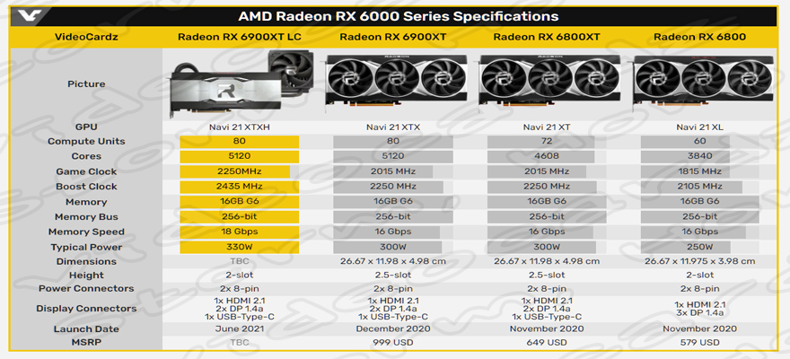더 높이 바인딩된 Navi 21 XTXH GPU는 AMD Radeon RX 6900 XT 그래픽 카드 클럭 속도보다 높은 2250 MHz 게임 및 2435 MHz 부스트 된 클럭을 보여주었습니다.St그래픽 카드는 레이 트레이싱을 활성화하기 위한 8000개의 레이 트레이싱 가속을 가지고 있습니다. (컴퓨팅 장치당 하나의 RA).St그래픽 카드의 TBP는 330W라고 합니다.