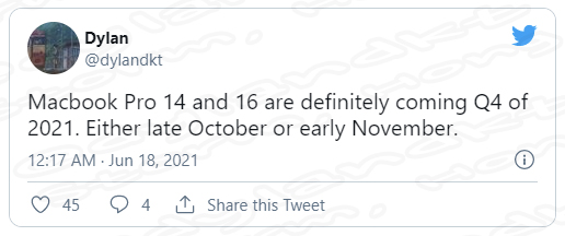 트위터에서 dylandkt는 MAC mini, 14 inch (14 인치) / 16 inch 1(6 인치) 로 나올 것으로 알려진 M1X MacBook Pro 모델의 출시 소식이 계속해서 예상, 예측, 루머, 소문에 의하면 10월 말 또는 11월 초에 출시될 것이라고 알려지고 있습니다. Apple은 2020년 11월 10일 M1 제품을St발표 했으며,  dylandkt의 예상,St예측에 의하면 앞으로 몇 달 안에는 많은 일이 일어날 수 있을 것으로 전해졌습니다.