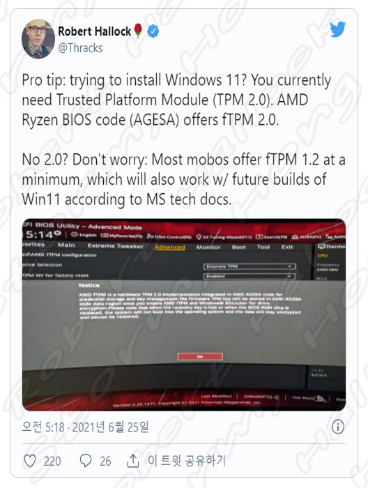 AMD Robert Hallock에 따르면 TPM 2.0이 없더라도 대부분의 Ryzen 메인보드에서는 Windows 11 운영 체제에서 쉽게 작동할 수 있는 최소 fTPM 1.2가 있다고 알려지고 있습니다. 또한 다가오는 내부자 빌드 TPM 2.0 하드웨어에서만 실행되지만 Windows 11 공식 릴리스는 TPM 1.2 하드웨어도 지원될 것이라고 알려지고 있습니다.