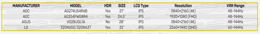 NVIDIA 또한 GeForce 471.11 WHQL Game Ready 드라이버가 포함된 새로운 G-Sync 호환 디스플레이를 발표했습니다. ( 아래 표에서 확인해 주시기 바랍니다. )