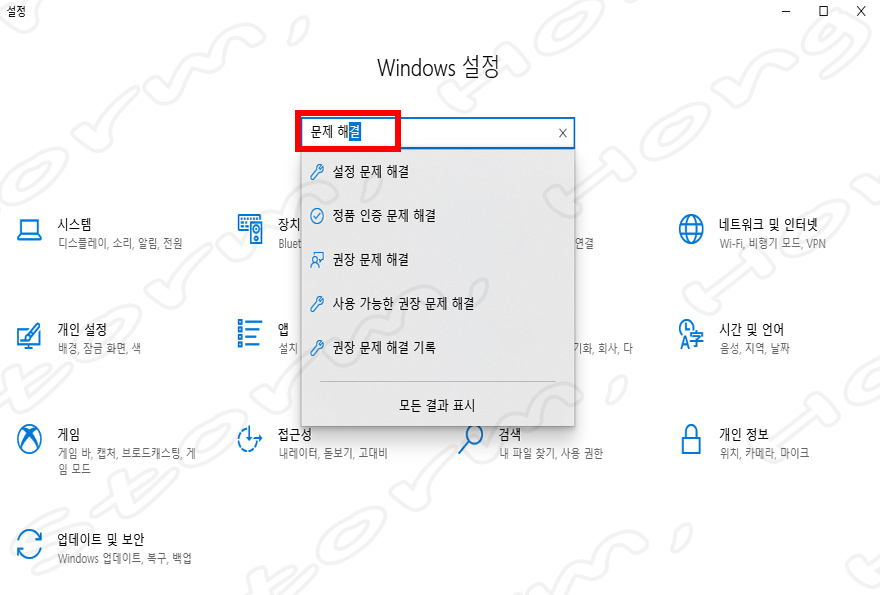 2. 설정 검색창에 '문제 해결' 입력하고 엔터를 눌러줍니다.