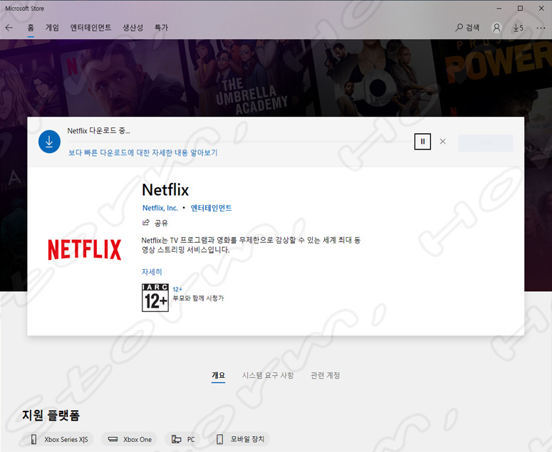 5. Netflix (넷플릭스) 받기를 누른 다음에는 설치 화면으로 넘어가며 설치 버튼을 누르면 다음 화면이 나옵니다.