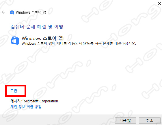 ↑ 'Microsoft Store 앱 문제를 찾아 해결합니다' 찾은 화면입니다.