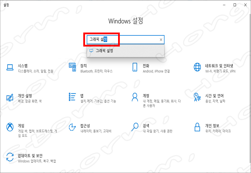 ↑ 빨간 네모창에서 찾고자 하는 이름을 입력하면 찾을 수 있습니다. (현제는 '그래픽 설정' 을 입력한 화면입니다.)