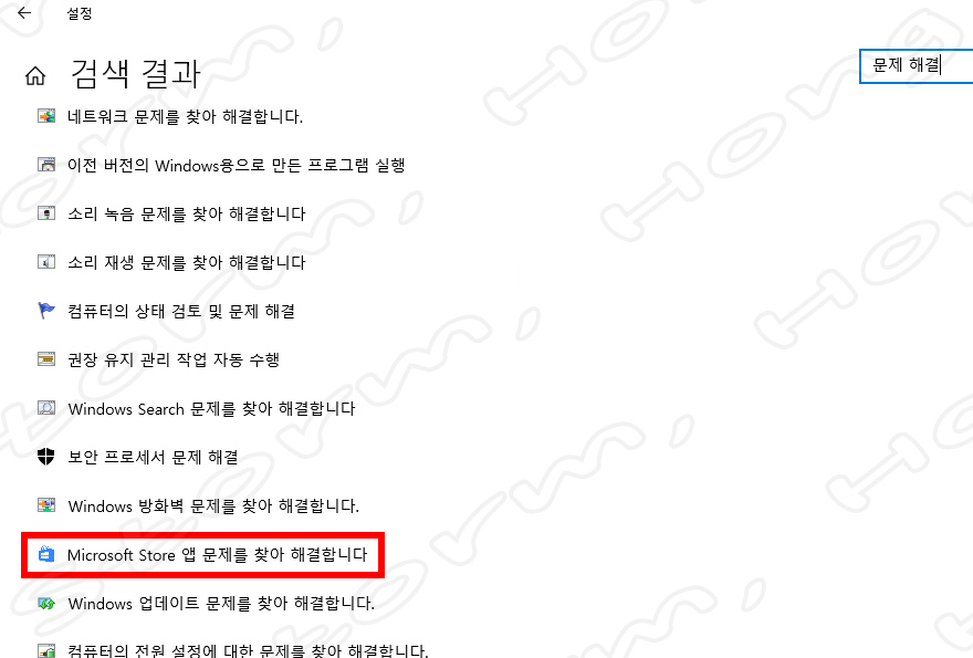 3. 검색 결과에서 Microsoft store 앱 문제를 찾아 해결을 눌러줍니다.