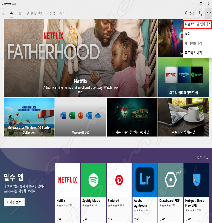 ↑ 'Microsoft Store'를 구동 후 다운로드 업그레이드 위치입니다.