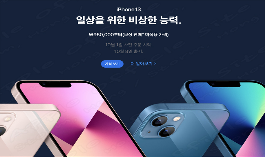 iPhone 13 mini (아이폰 13 미니) 는 한화 95만원부터 출시, iPhone 13 (아이폰 13) 는 한화 1,090,000 만원부터 출시, 예정이며 용량별로는 다음과 같습니다.