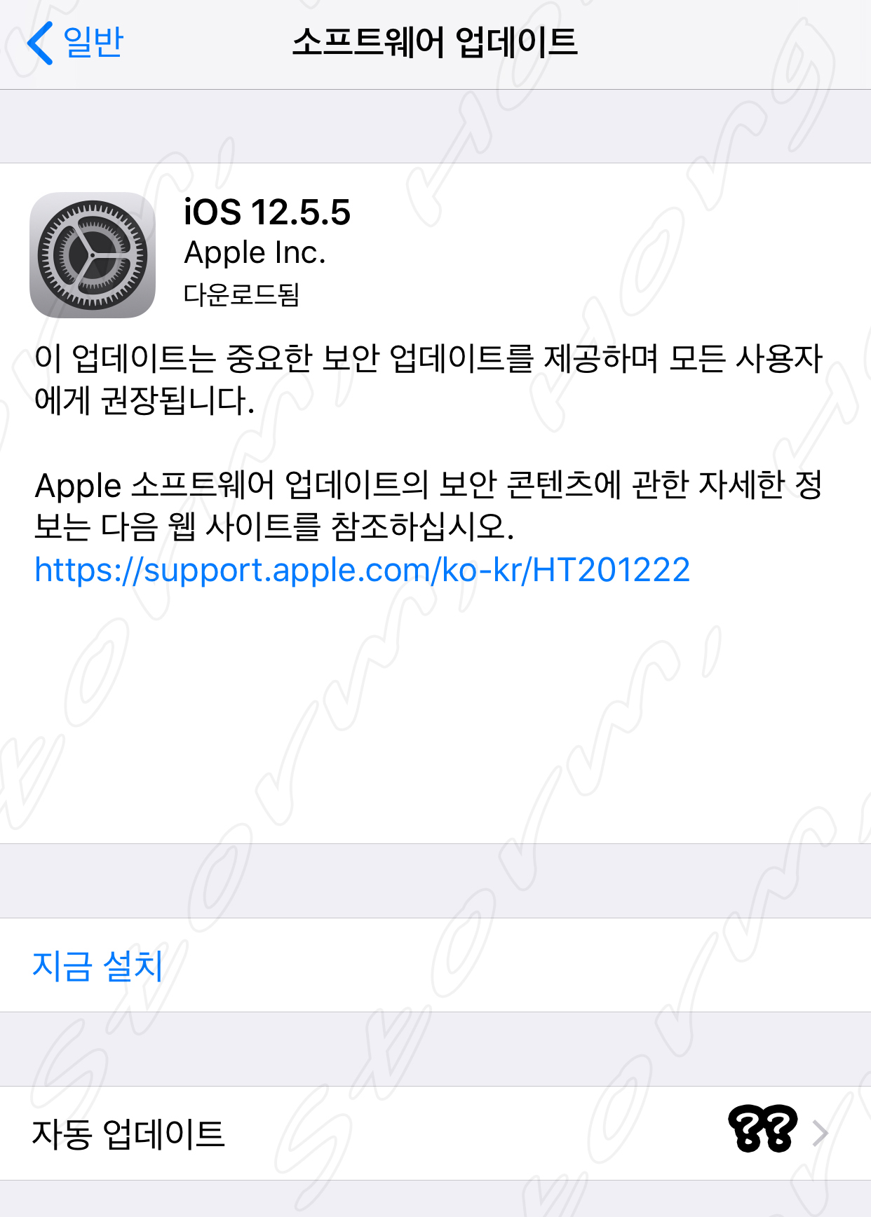 현재 iOS 12.5.5 이하의 버전인 경우 iOS 12에서 생기는St버그 또는 성능 문제가 발생할 수 있기 때문에 iOS 12.5.4 업데이트를 설치하는 것을 권장드립니다.
